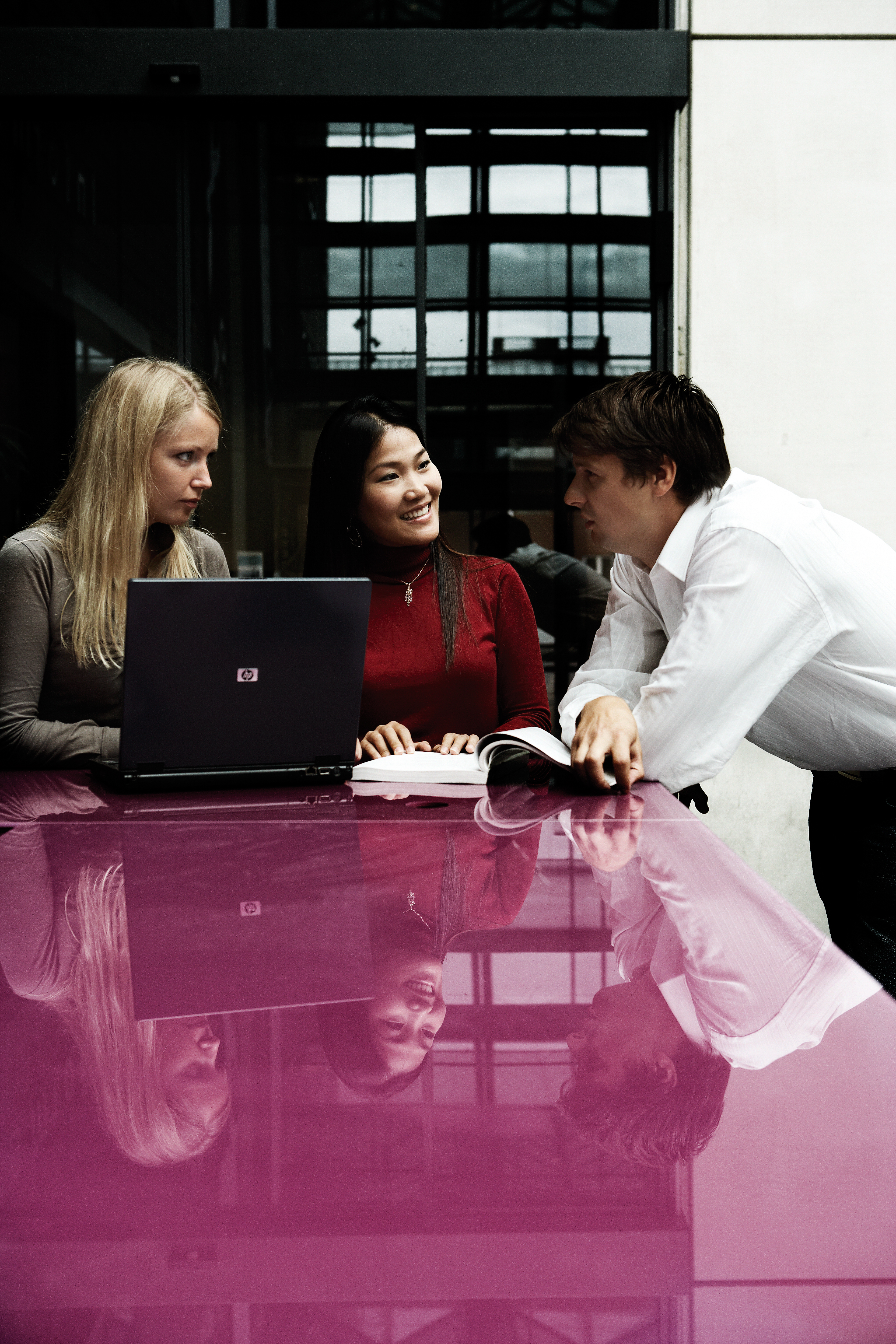 You are here: Home Photos STDK. Tre CBS studerende ved pink bord